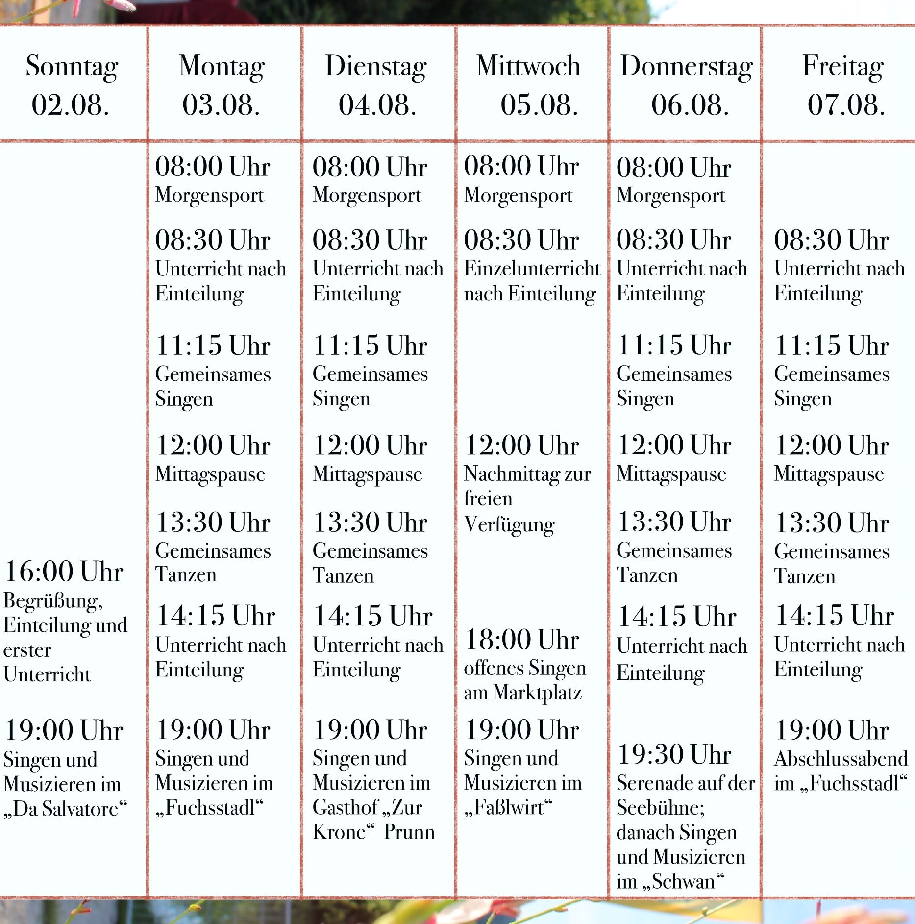 Die genaue Einteilung der Einzel- und Gruppenunterrichtsstunden kann erst bei der Begrüßung bekanntgegeben werden, aber grobe Zeitplan sieht so aus: